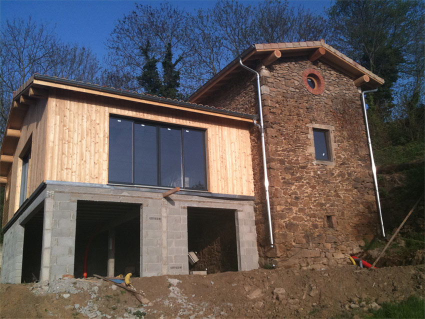 La cellule familiale ayant évolué en même temps que le chantier, l’aménagement du sous-sol a été modifié pour être aménageable en appartement indépendant. Cette agrandissement se situant dans une commune rurale, l’agrandissement a été imaginé en bois, avec des formes simples, des grandes fermetures coulissantes, et un bardage en mélèze posé verticalement, façon grange de ferme. Une exception autour de l’œil de Bœuf, le rythme du bardage a été modifié pour mettre en valeur cette ouverture ronde. Le choix des grandes baies à l’est et au sud permet un apport solaire passif et une vue magnifique sur la campagne environnante et quelque fois sur la chaîne des alpes.