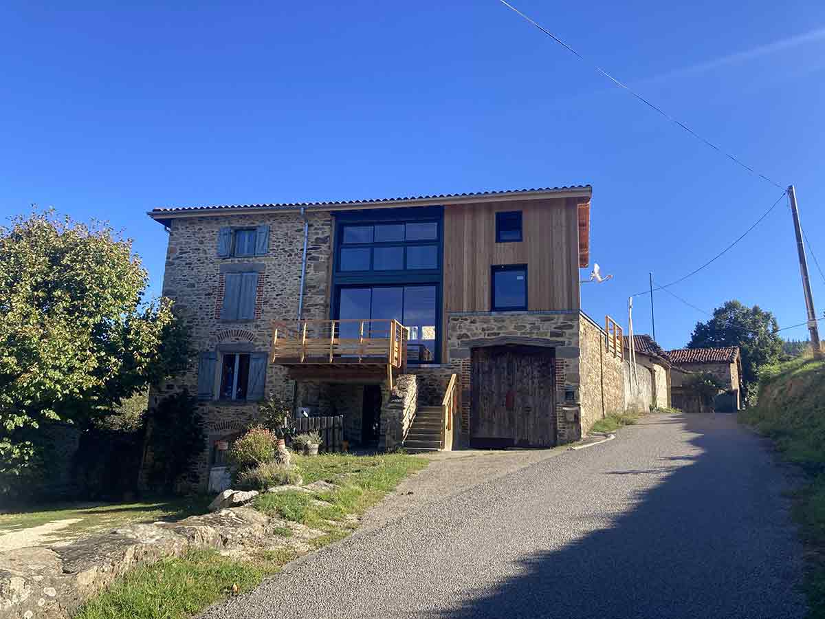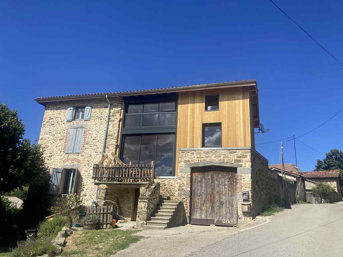 Suite a l'incendie d'un des gites de cette ferme historique et familiale, nous avons travaillé avec les propriétaires, les architectes du Parc du Pilat et la mairie pour reconstruire une extension de cette grosse bâtisse en pierre, remarquable.